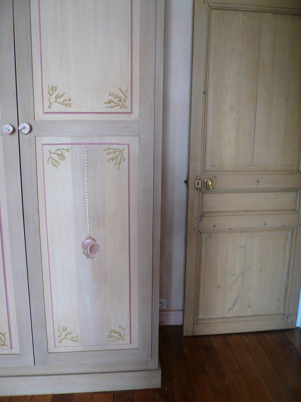 Décor coquillage pour un placard pour un hôtel particulier à Neuilly. Peinture acrylique sur bois brut.