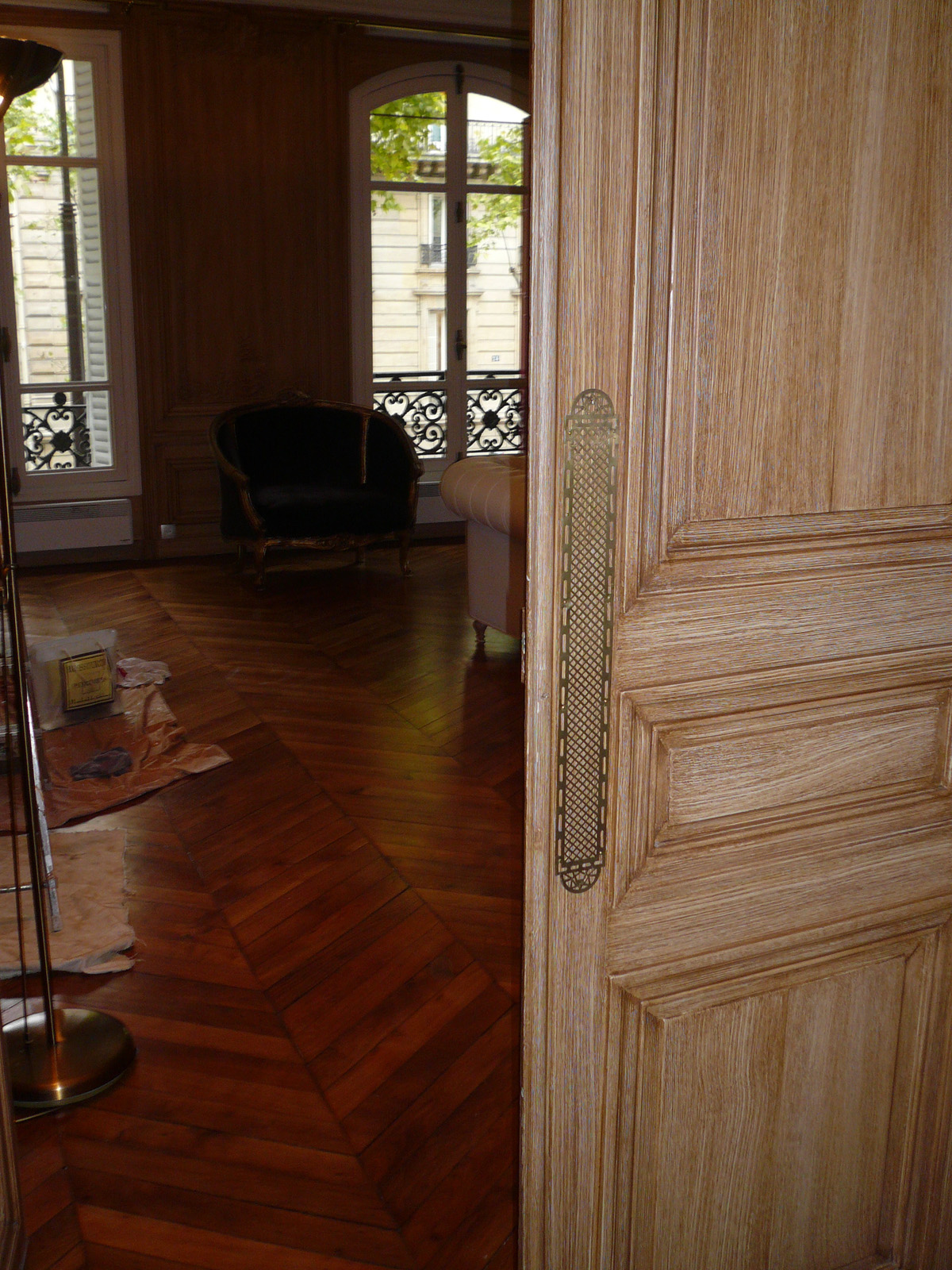 Pour un appartement avenue de Messine à Paris, boiseries peintes en trompe-l'oeil de chêne cérusé. Peinture à l'huile.