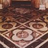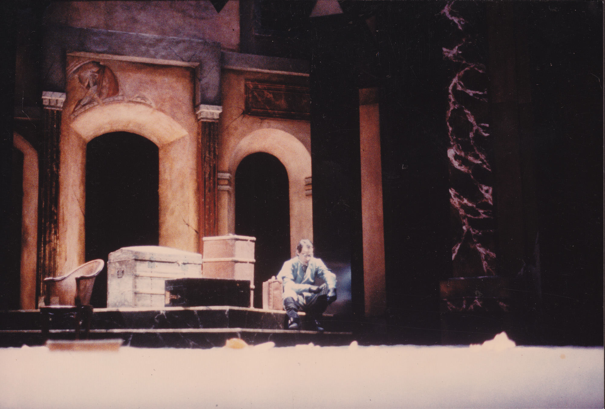Spectacle "Lorenzaccio" de Musset au théâtre Gérard Philipe à Saint-Denis. Mise en scène Daniel Mesguich, scénographie Alain Batifoulier. Toile peinte, peinture acrylique, feuille de métal, stuc sur panneaux.