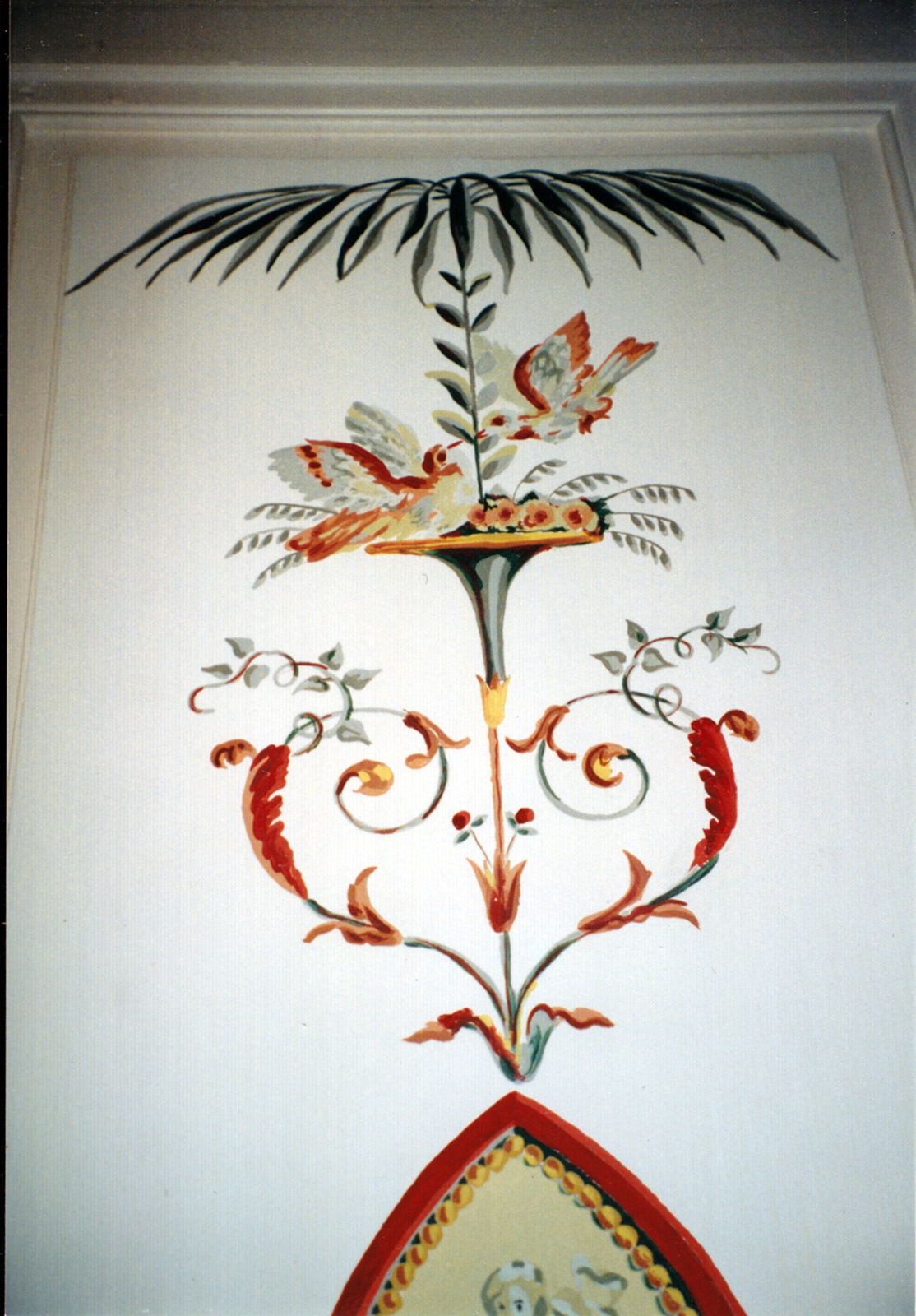 Pour un appartement parisien, grotesque sur boiserie, d'après documents d'époque. Peinture à l'huile.