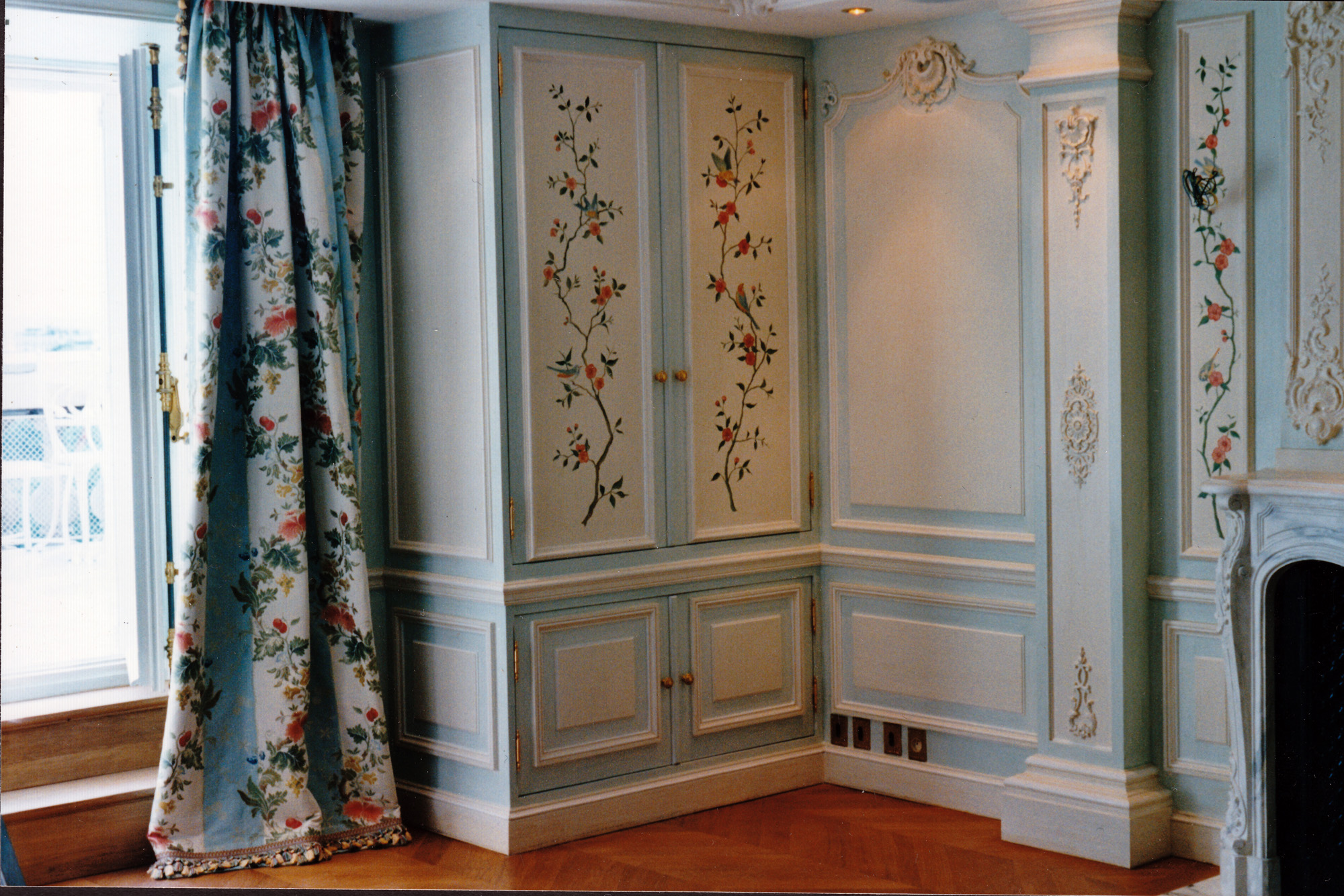 "Chinoiserie" pour une suite de l'hôtel de Crillon à Paris. Peinture à l'huile sur toile, marouflée, et patine à l'eau.