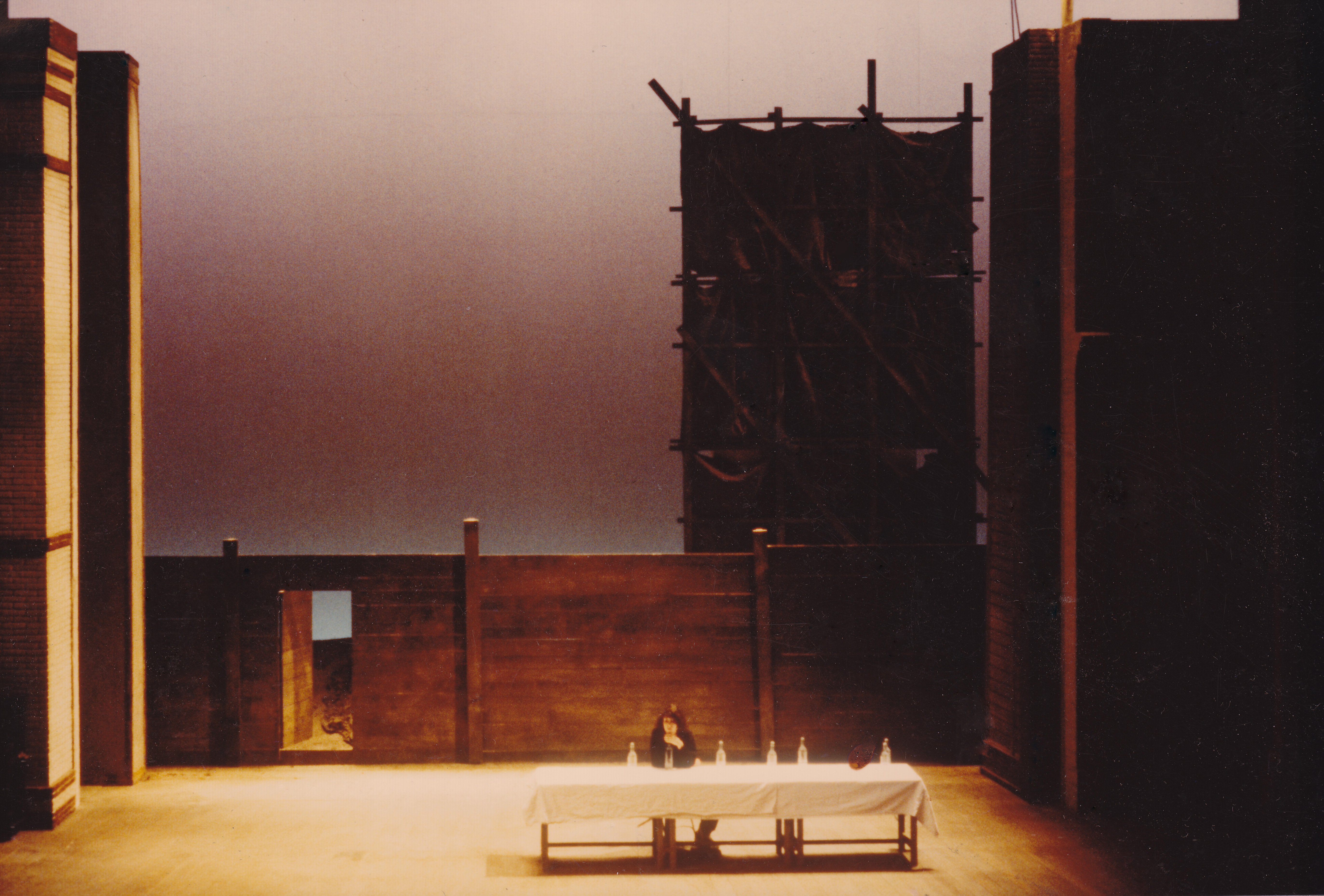 Spectacle "le Legs et l'Epreuve" de Marivaux au théâtre des Amandiers. Mise en scène Claude Stratz, scénographie Frédéric Robert. Peinture acrylique, sable, latex, terre.